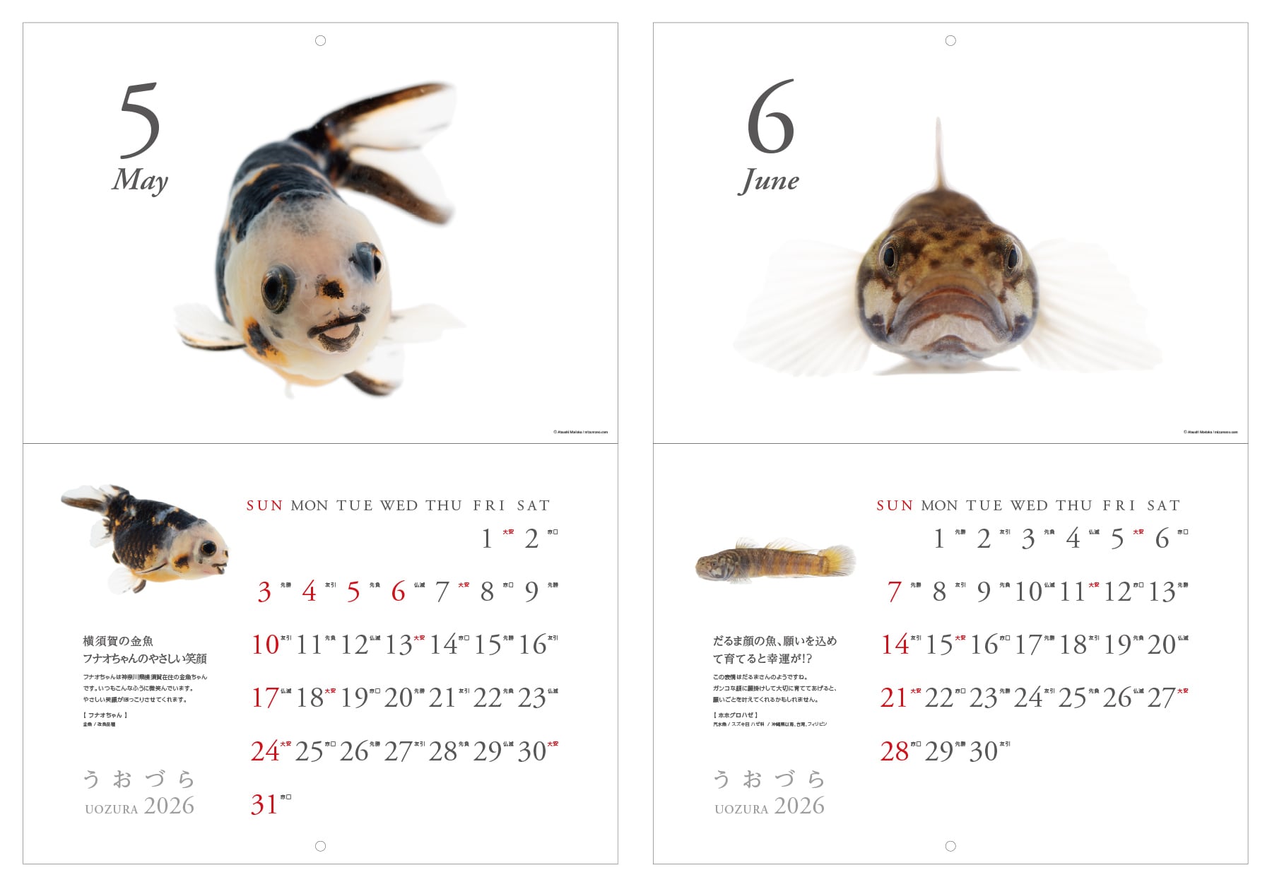 無愛想に見える観賞魚たちを真っ正面から撮影してみると、まるでなにかを語りたそうなキュートでユーモラスな表情が写りました。そんな可愛くてユニークな“正面顔”ばかりを厳選して集めた2026年版カレンダー【うおづらカレンダー2026 金魚・熱帯魚】。